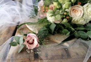 Wszystkie kompozycje wykonane na ten ślub i wesele były bujne, pełne kwiatów i naturalnej zieleni – bukiet ślubny, dekoracja samochodu, dekoracja sali weselnej. Pomimo klasycznego wystroju sali (stonowane kolory, elegancja, wyważona dekoracyjność) zielone i bujne kompozycje w kielichach na stołach gości oraz kompozycja na stole prezydialnym wraz ze świecami przed stołem, pięknie ze sobą współgrały.