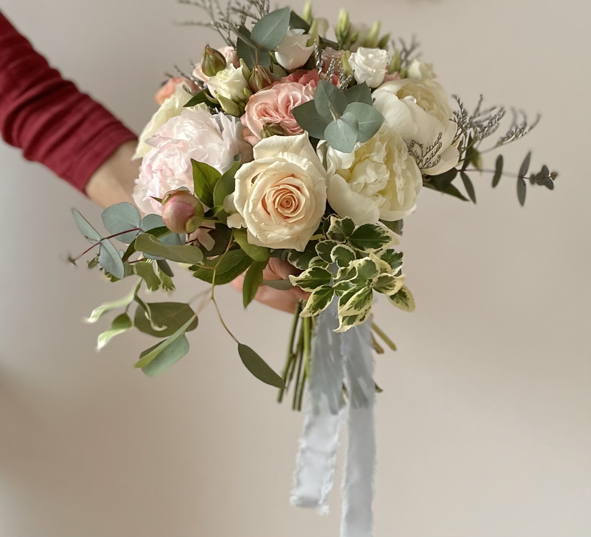 Bukiet Pani Alicji wykonałam z róż, róż gałązkowych i przepięknych piwonii. Okrągły, ale dość luźny, z wystającymi gałązkami limonium. Rączka owinięta błękitnym szyfonem ręcznie szarpanym.