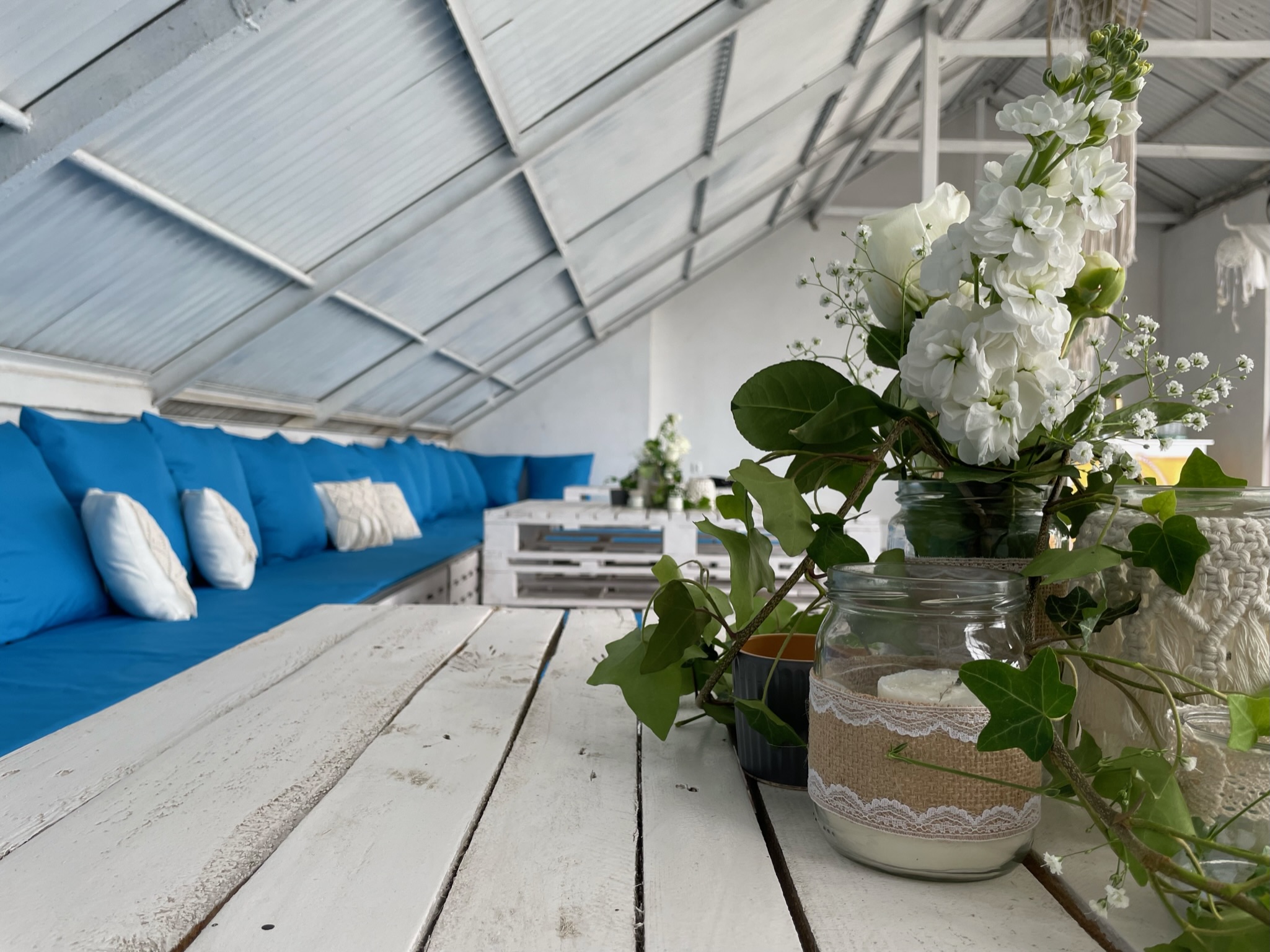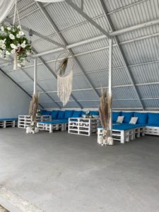 Tuż przy sali znajdowała się duża wiata, do której późnym wieczorem przeniosła się impreza. Tutaj pojawiły się makramy, wygodne poduchy (także udekorowane makramą), lampiony, mnóstwo świec, zieleni i białych kwiatów.