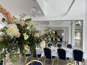 Klasyczna, biała sala udekorowana kompozycjami na wysokich, złotych stojakach, kompozycja na stole prezydialnym oraz duże koła na ściance za państwem młodym to dużo zieleni, jasne pastelowe kwiaty, roztaczające nieziemski zapach (lewkonie !).