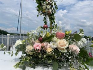 W podobnym klimacie urządzone było miejsce ceremonii ze ścianką tworzącą biały żagiel na tle żaglówek kołyszących się na wodzie. A po części oficjalnej, ścianka i zawieszona na niej rama stały się oryginalnym miejscem do pamiątkowych zdjęć.