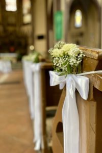 Na życzenie panny młodej, Pani Anny, bukiet, wianek i pozostałe akcesoria zawierają różowe i jasno fioletowe kwiaty takie jak ogrodowa gałązkowa róża czy ostóżki. Bukiet nieduży ale rozłożysty, lekki, wykończony szyfonową taśmą.