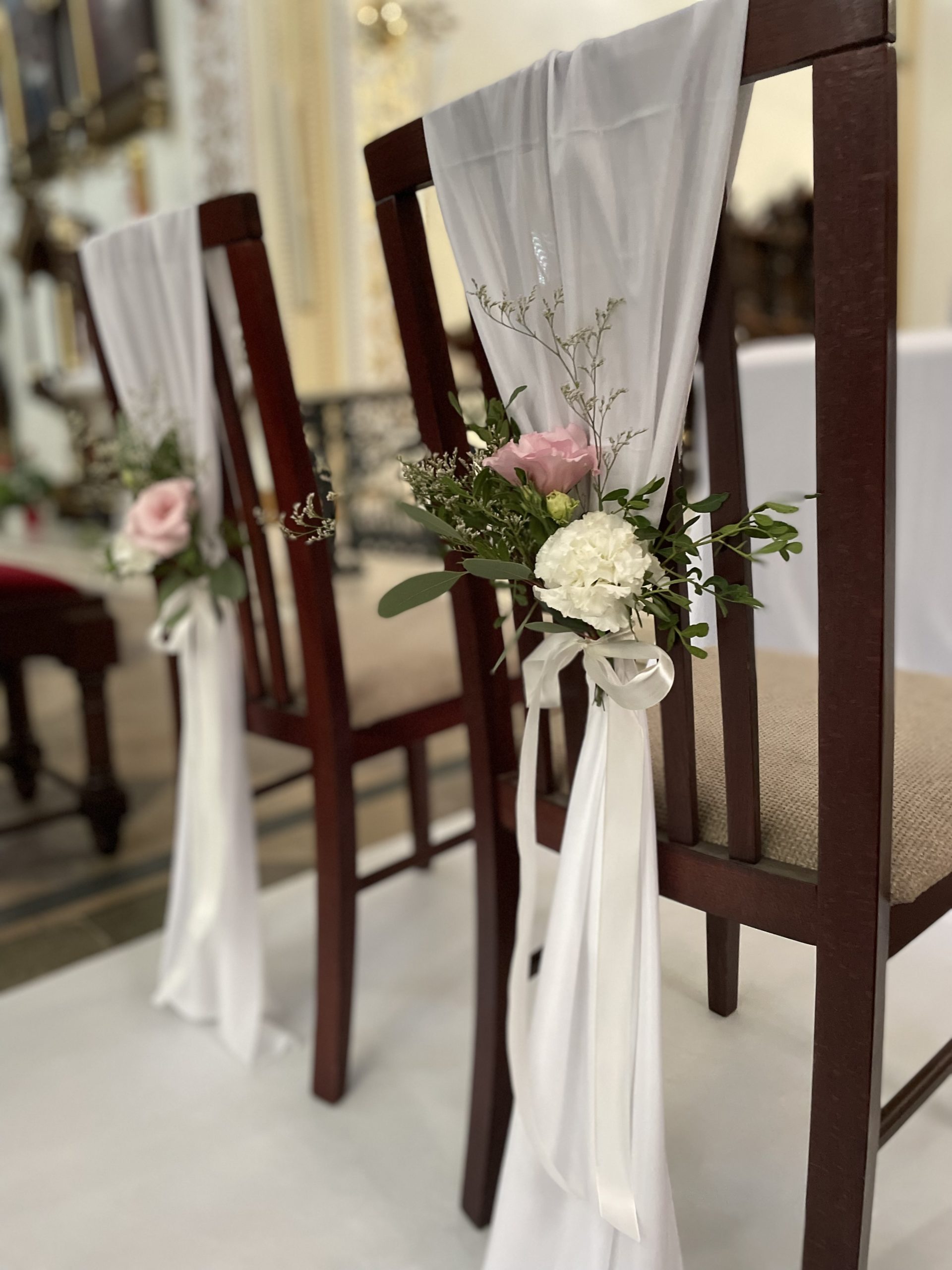 Delikatne przystrojenie kościoła – ławek oraz krzeseł Państwa Młodych i świadków.