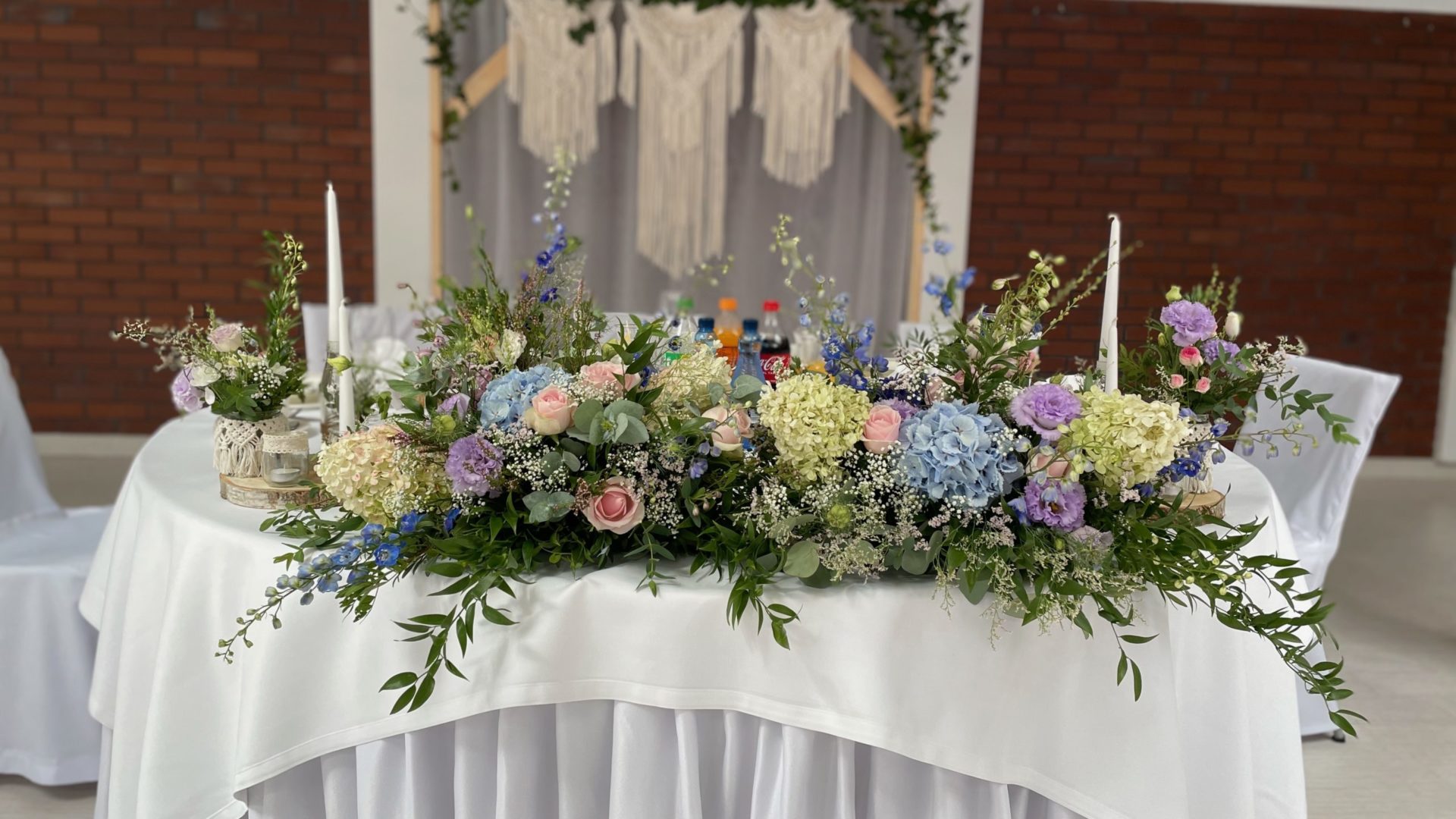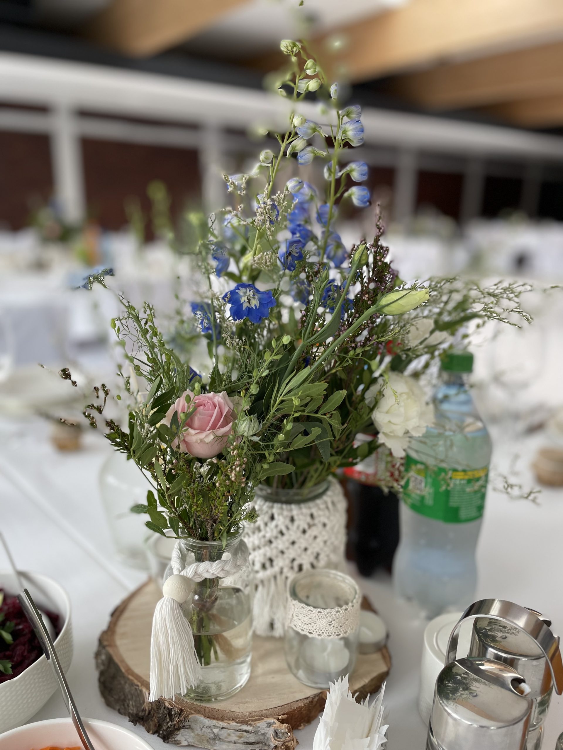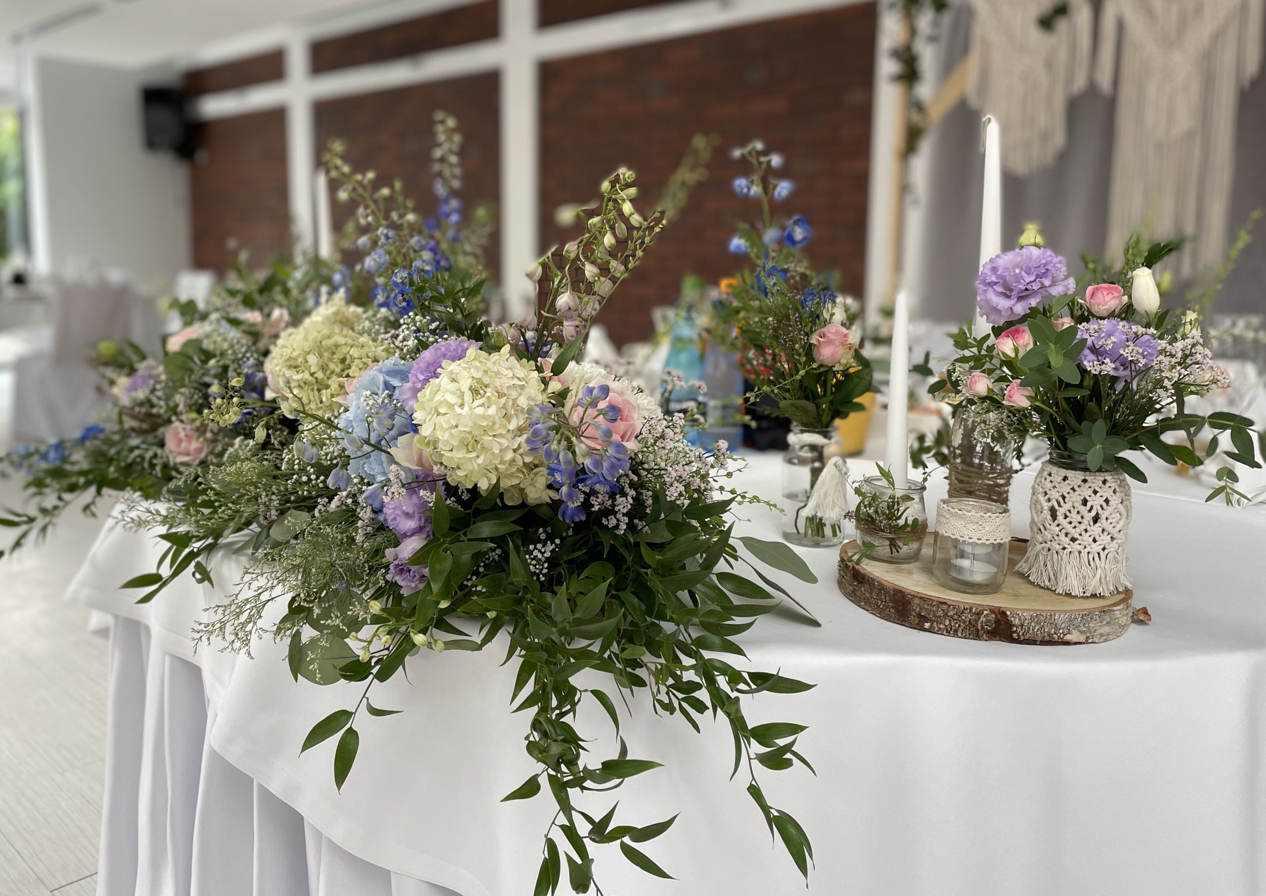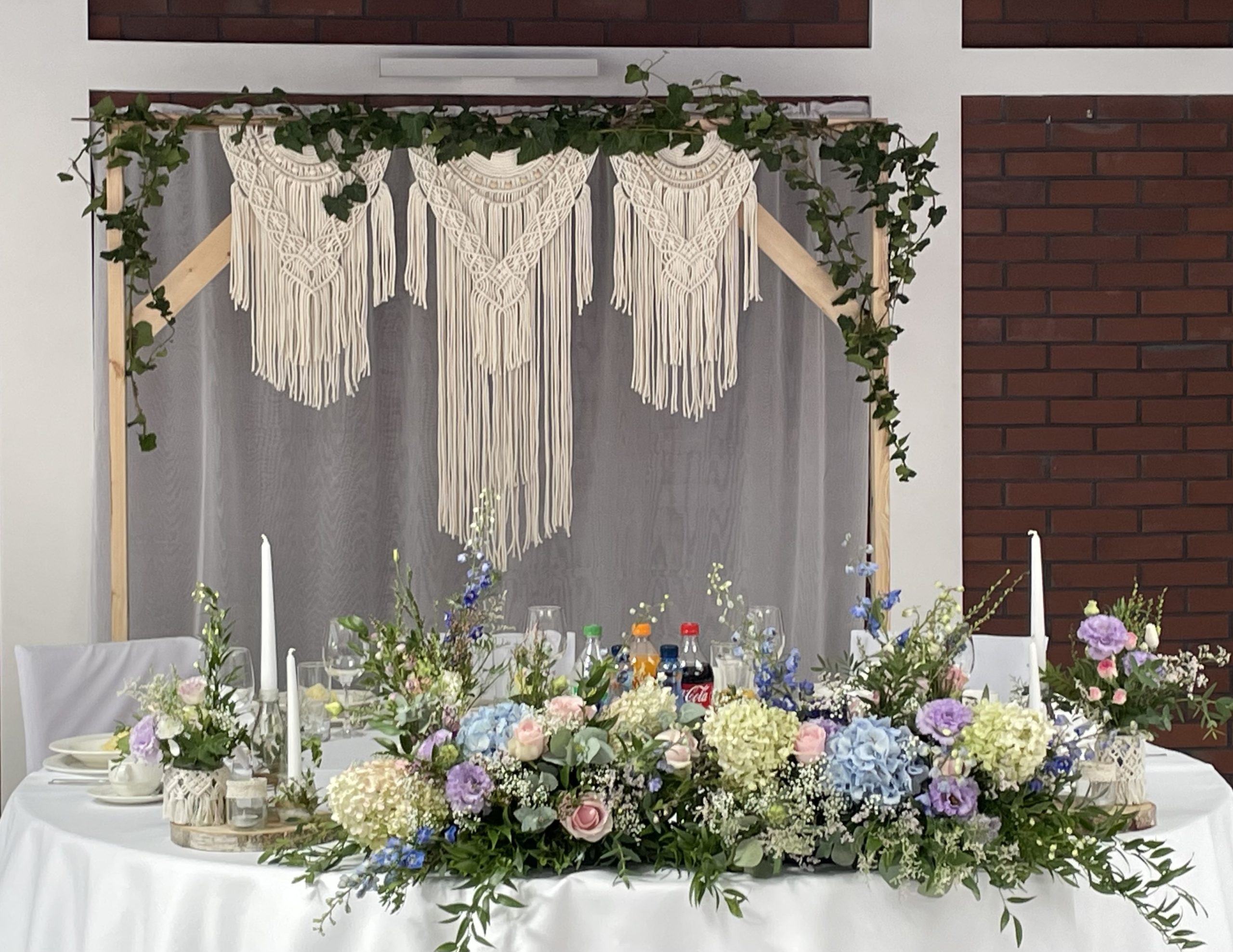 Sala weselna Świetlik w Bytomiu, charakterystyczna przeszklona ściana z widokiem na ogród. Dekoracja sali to bujna kompozycja na stole prezydialnym, i układy małych bukiecików na stołach gości. Dopełnieniem kwiatów są dekoracje wykonane techniką makramy – lampiony, wazoniki, ścianka za Państwem Młodym. Wszystko wykonane przez mnie, z możliwością wypożyczenia na Wasz ślub .