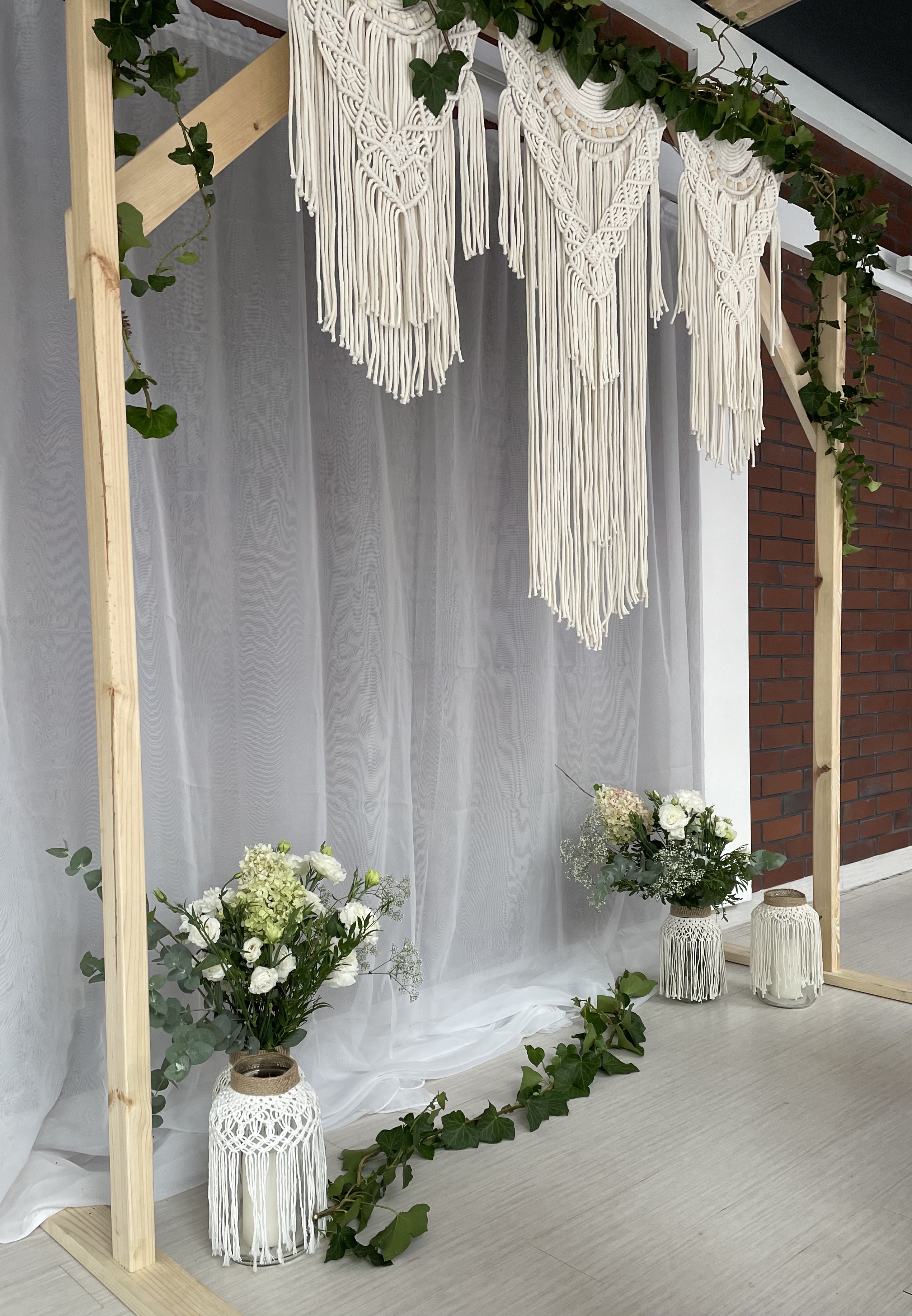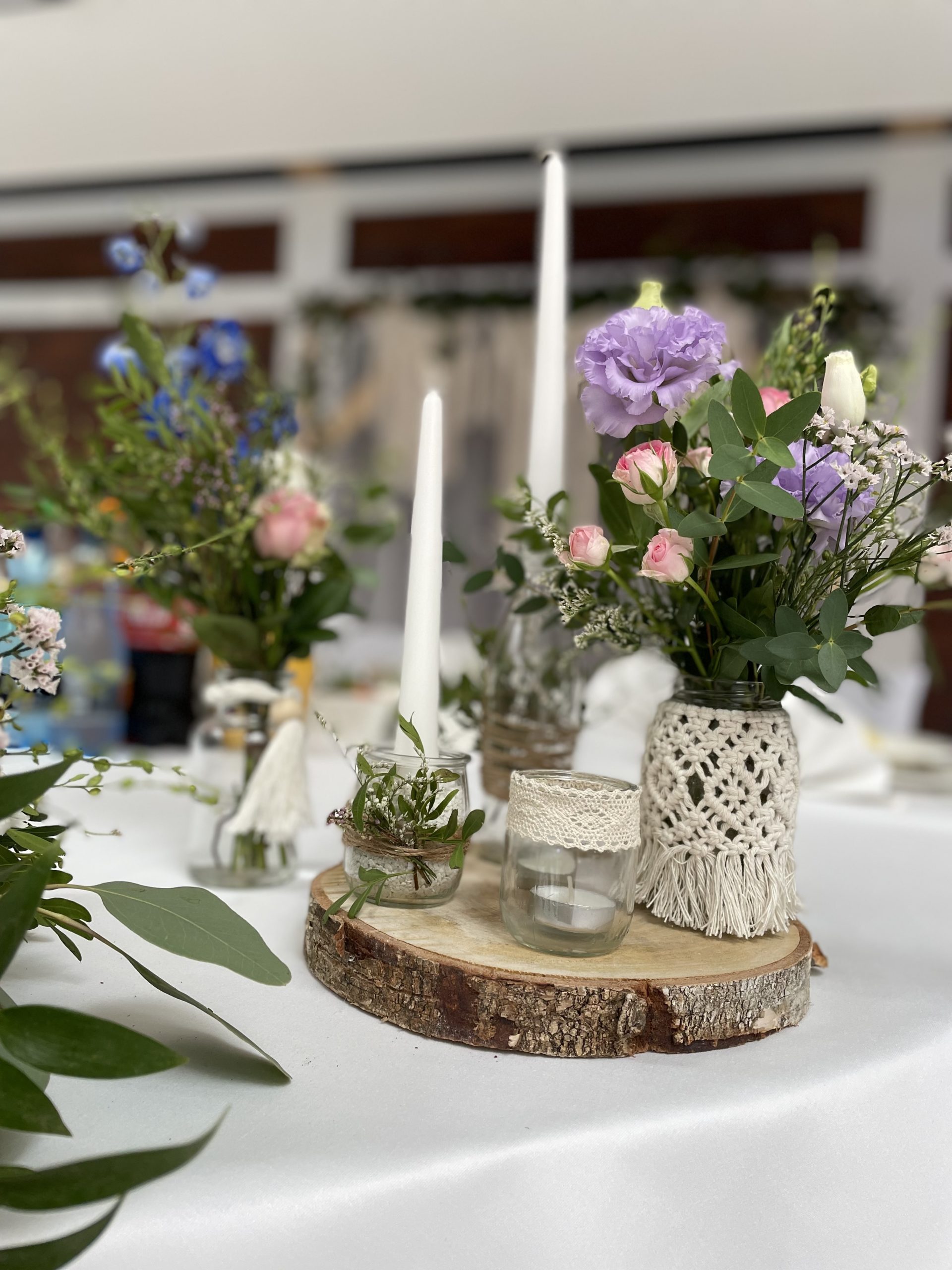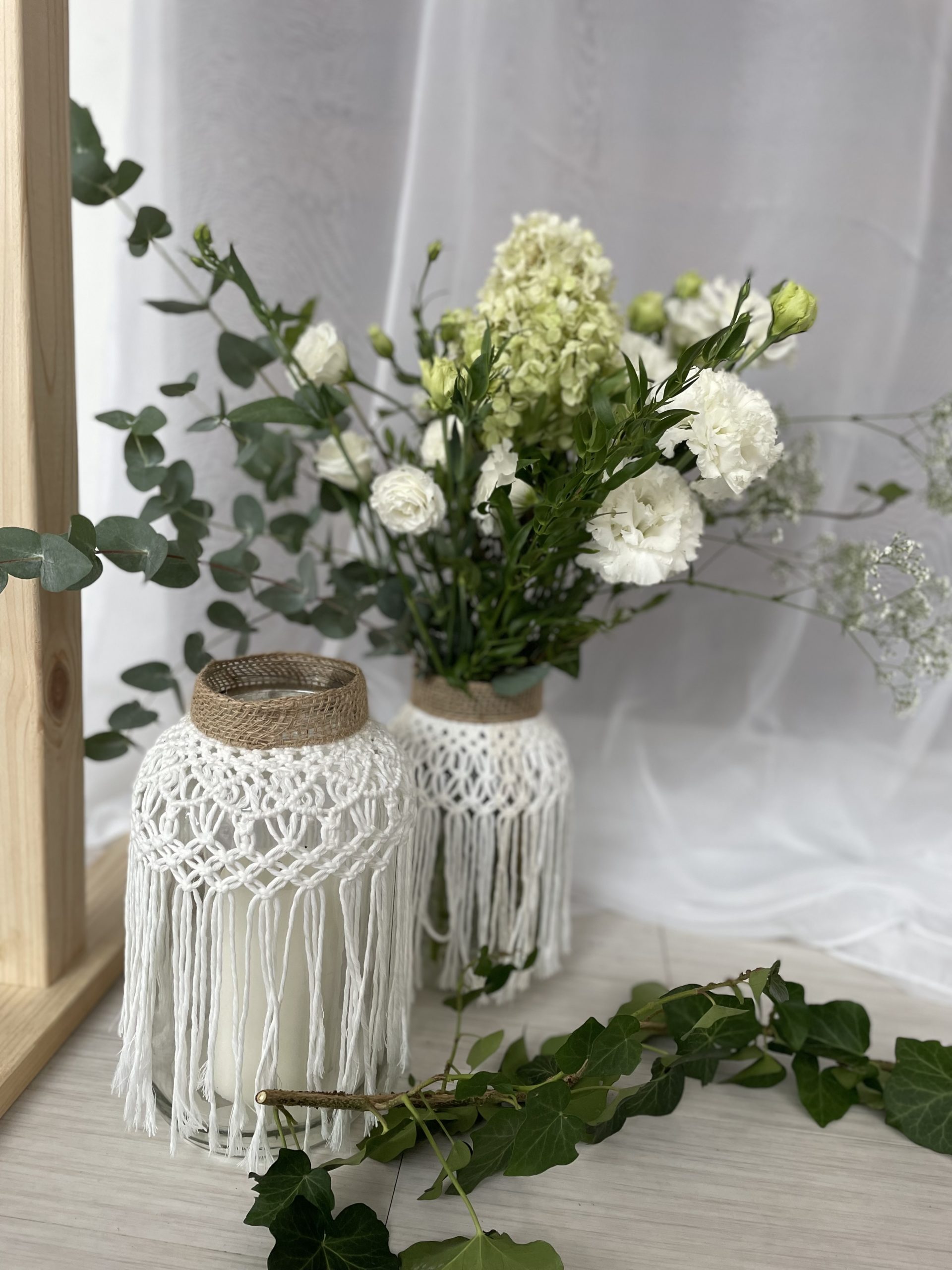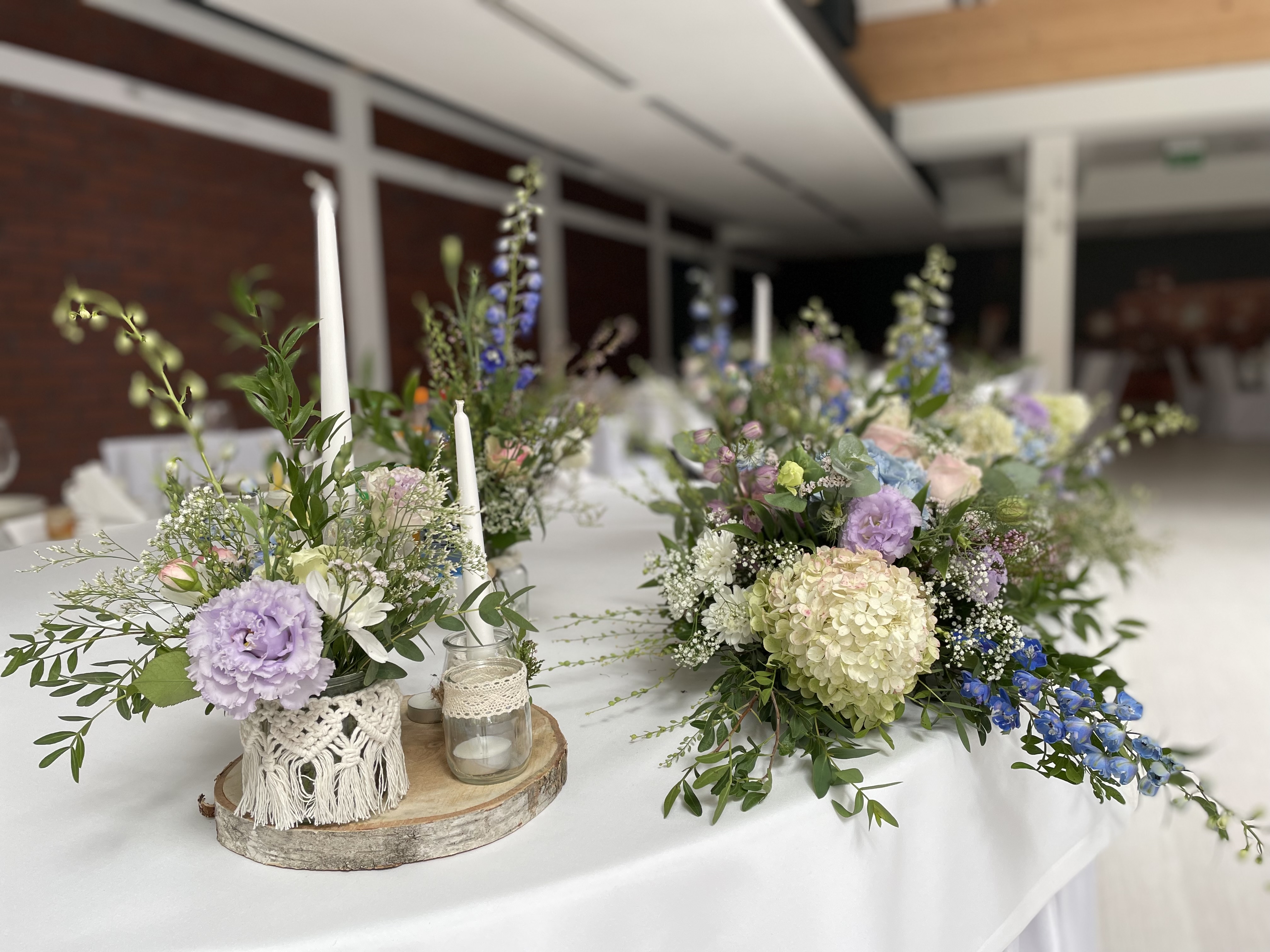 Sala weselna Świetlik w Bytomiu, charakterystyczna przeszklona ściana z widokiem na ogród. Dekoracja sali to bujna kompozycja na stole prezydialnym, i układy małych bukiecików na stołach gości. Dopełnieniem kwiatów są dekoracje wykonane techniką makramy – lampiony, wazoniki, ścianka za Państwem Młodym. Wszystko wykonane przez mnie, z możliwością wypożyczenia na Wasz ślub .