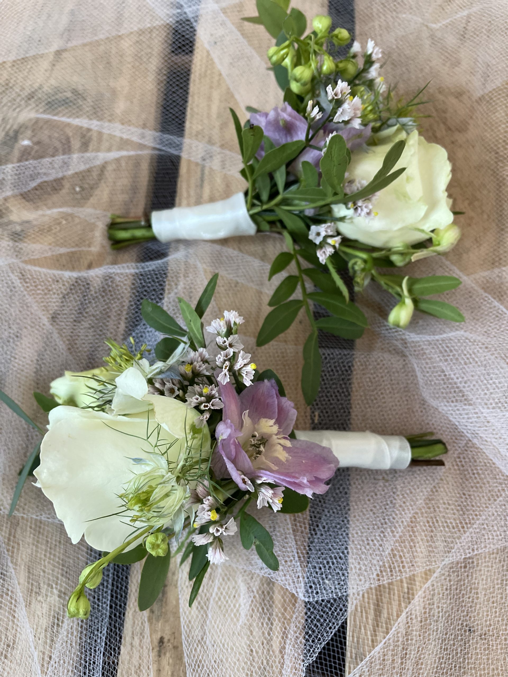 Butonierka wykonana z róż z dodatkiem ogrodowych kwiatów.